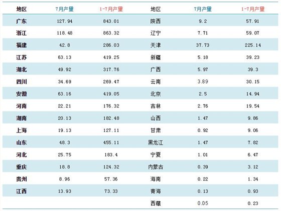 1-7月塑料制品累計產(chǎn)量排名前五位(廣東、浙江、安徽、江蘇和湖北)的總產(chǎn)量達(dá)到2862.39萬噸,占到全國總產(chǎn)量53.8%。(按7月規(guī)模企業(yè)統(tǒng)計)