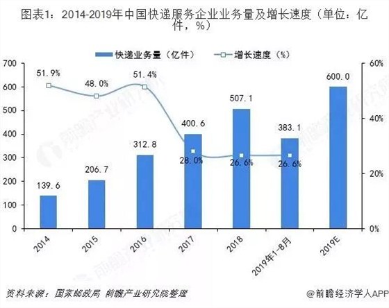 由數(shù)據(jù)可見,2017年中國快遞業(yè)務量突破400億件;2018年中國快遞業(yè)務量突破500億件;2019年快遞業(yè)務量又突破600億件。據(jù)快遞業(yè)“十三五”發(fā)展指標,2020年我國的快遞量將有望達到750億件,人均快件從2000年的0.01件增長到2020年的約50件。