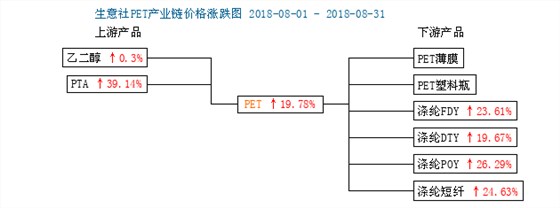 根據(jù)生意社監(jiān)測(cè)的數(shù)據(jù)顯示,8月1日PET水瓶級(jí)廠家報(bào)價(jià)9439元/噸,8月31日PET水瓶級(jí)廠家報(bào)價(jià)11306元/噸,價(jià)格整體上漲1500-2000元/噸,整體漲幅19.78%,本月PET行情大幅上漲。