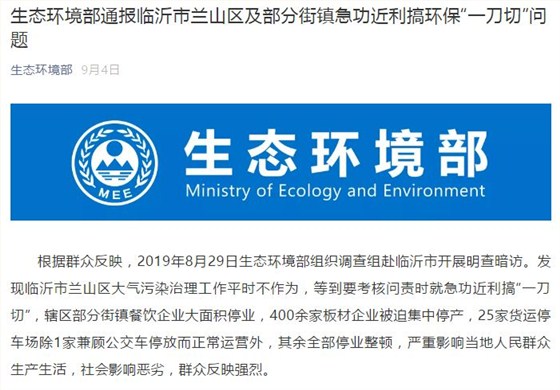 而就在不久前,生態(tài)環(huán)境部組織調(diào)查組在山東省臨沂市明查暗訪后,通報(bào)了一起典型案例:山東臨沂大氣污染治理工作平時(shí)不作為,等到要考核問責(zé)時(shí)就搞“一刀切”,造成轄區(qū)部分街鎮(zhèn)餐飲企業(yè)大面積停業(yè),400余家板材企業(yè)集中停產(chǎn),20多家貨運(yùn)停車場停業(yè),嚴(yán)重影響當(dāng)?shù)厝嗣袢罕娚a(chǎn)生活。