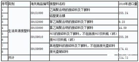 2017年底前調(diào)整為禁止進(jìn)口的生活來源廢塑料目錄及2016年進(jìn)口量情況
