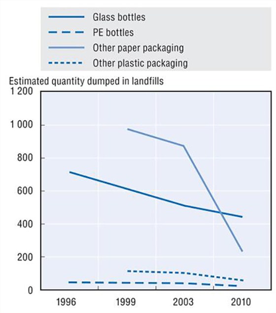 日本各類包裝類廢棄物的填埋量(OECD, 2016)