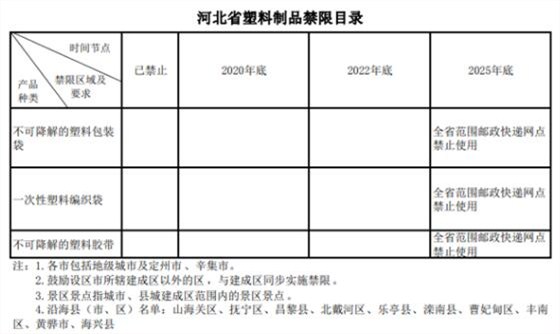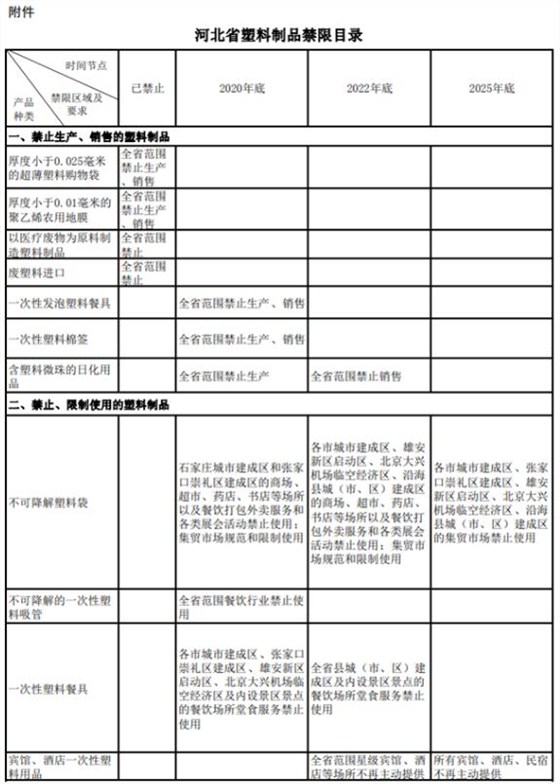 到2020年底,率先在省會石家莊、張家口市崇禮區(qū)等部分地區(qū)和重點領(lǐng)域禁止和限制生產(chǎn)、銷售和使用一批塑料制品。