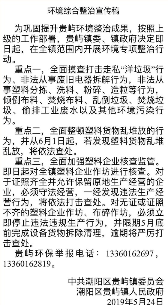 5月24日,廣東省汕頭市潮陽區(qū)貴嶼鎮(zhèn)發(fā)布《環(huán)境綜合整治宣傳稿》,即日起,在全鎮(zhèn)范圍內(nèi)開展環(huán)境專項整治行動。