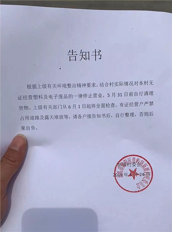 新厝村委會:無證經(jīng)營塑料及電子廢品一律停止?fàn)I業(yè),5月31日前自行清理貨物。