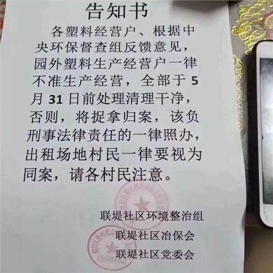 聯(lián)堤社區(qū)居委會:無證照園外塑料生產(chǎn)經(jīng)營戶一律不準(zhǔn)經(jīng)營,全部于5月31日前清理干凈。