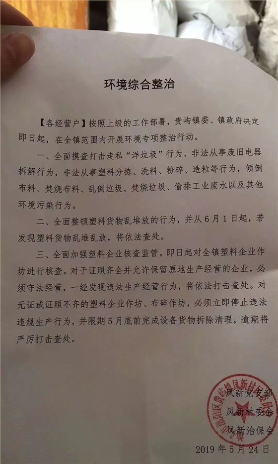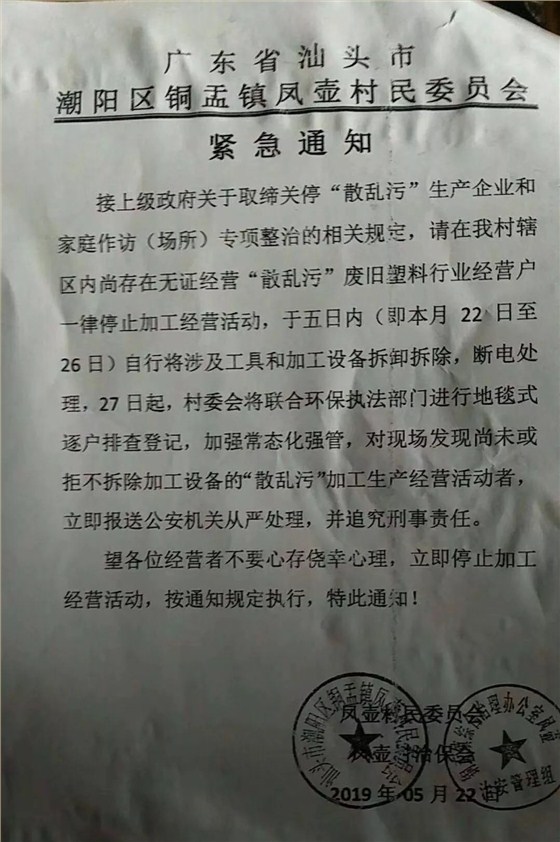 鳳壺村委會:無證經(jīng)營廢塑料企業(yè)一律停止加工,并自行將加工設(shè)備拆除、斷電,5月27日起將地毯式登記,拒不配合的經(jīng)營者將移送公安機關(guān)。