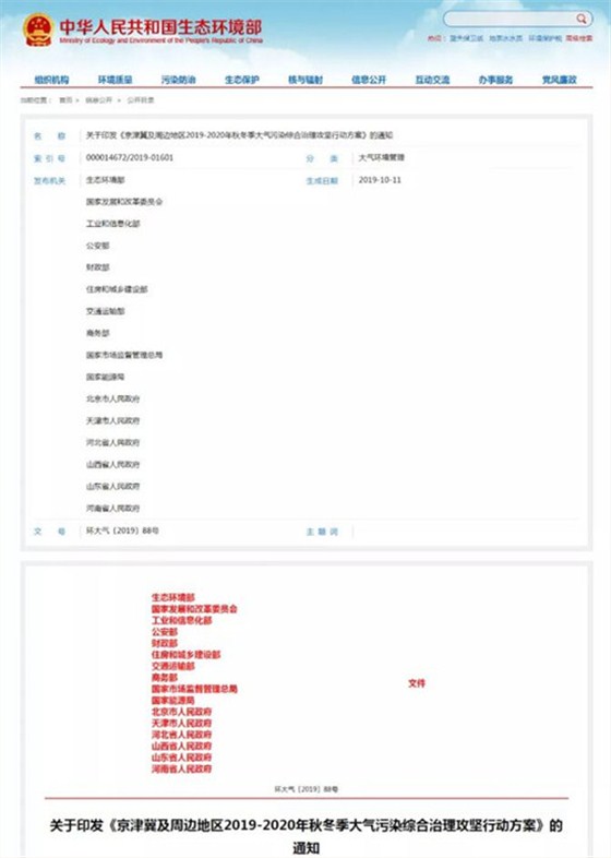 京津冀及周邊地區(qū)2019-2020年秋冬季大氣污染綜合治理攻堅(jiān)方案