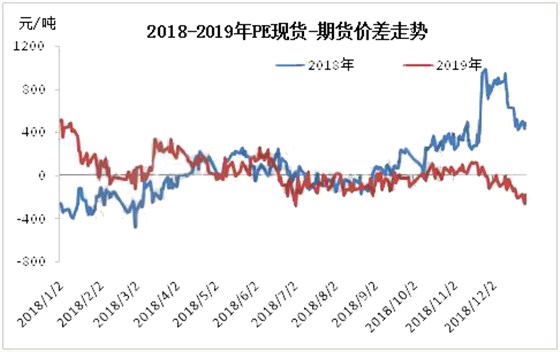 2019年中國PE期現(xiàn)基差范圍較2018年縮窄,以華北煤化工7042價格與LL主力合約結(jié)算價基差來看,全年升貼水范圍在520元/噸以內(nèi),且基差多處于正值。2019年中國PE市場供需壓力加大,7-9月,中美貿(mào)易摩擦升級,市場擔(dān)憂情緒加重,現(xiàn)貨價格弱勢下行,并跌破十年歷史低位,此階段現(xiàn)貨端壓力大于期貨,基差處于負(fù)值。