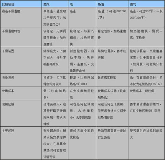 下面針對國內(nèi)常用四種干燥方式進行性能比較。