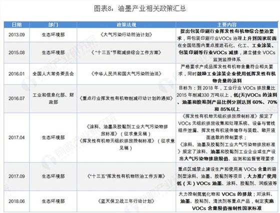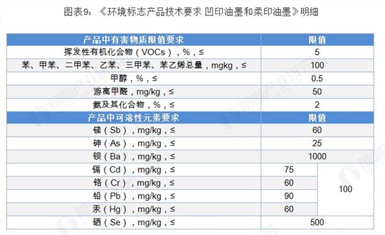 為明確凹印油墨行業(yè)的VOCs排放標準,2018年7月環(huán)保部正式發(fā)布《環(huán)境標志產(chǎn)品技術(shù)要求 凹印油墨和柔印油墨》,對凹印油墨和柔性油墨原材料、生產(chǎn)過程及產(chǎn)品中有毒有害物質(zhì)提出了環(huán)保要求,其中明確要求將凹印油墨和柔性油墨的VOCs排放限定在5%以內(nèi),并于2018年10月1日起正式實施