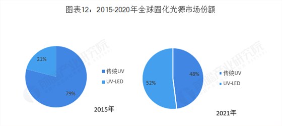 據(jù)市場調(diào)研機構(gòu)Yole預測,全球UV固化光源中UV-LED市場份額將由2015年的21%增長到2021年的52%。