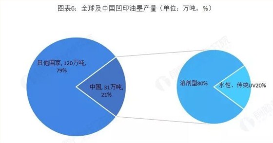 作為塑料軟包裝材料主要印刷方式的凹版印刷占比最高,達到42%,凹印油墨年產(chǎn)量約為31萬噸,占全球凹印油墨總量的21%左右,在中國,凹印油墨中約80%的產(chǎn)品為溶劑型油墨水性和UV僅占20%的份額