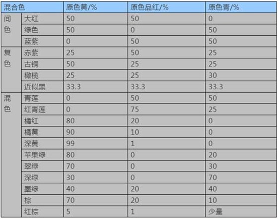 另外,色相差異應以異色油墨混合,飽和度差可以加入透明油墨調整,在三原色墨當中,各色墨的加入量,即相互比例非常重要,可獲得一系列顏色如: