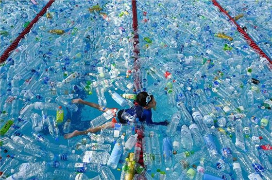 當(dāng)?shù)貢r(shí)間2019年6月8日,泰國(guó)曼谷,民眾在裝滿(mǎn)塑料瓶的游泳池里游泳,以紀(jì)念世界海洋日,警醒塑料污染。 (視覺(jué)中國(guó)/圖)
