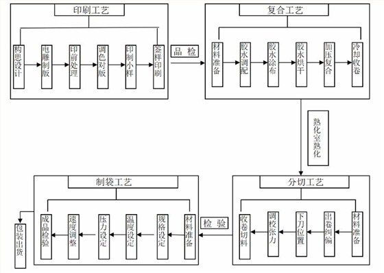 4)復合工序是將兩種或兩種以上的材料復合在一起,形成一體的材料。復合材料既可保持單層材料的優(yōu)良特性,又可克服其各自的不足,復合后具有新的特性,滿足食品等商品對復合材料的不同要求。