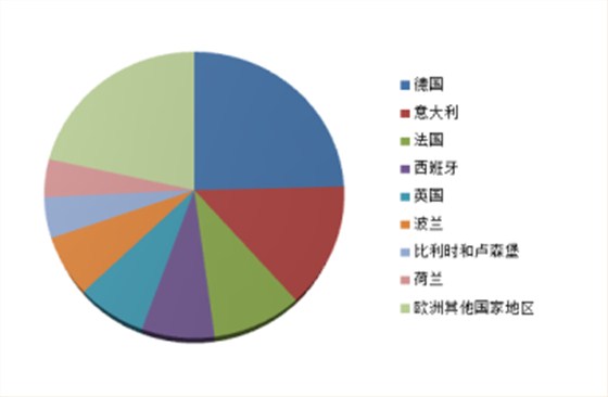 歐洲本土的塑料加工商對塑料需求量為5120萬噸,按地域分布劃分,德國塑料加工商的需求量最大,為24.6%,其次分別為意大利(13.9%),法國(9.4%),西班牙(7.6%),英國(7.3%),波蘭(6.8%),比利時(shí)和盧森堡(4.6%),荷蘭(4.3%),其他歐洲國家地區(qū)共占21.5%。