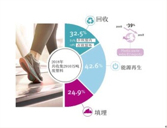 2018年歐洲共收集了2910萬噸廢塑料,其中32.5%的廢塑料進(jìn)行了回收再生,42.6%的廢塑料進(jìn)行了能源轉(zhuǎn)換,24.9%的廢塑料進(jìn)行了填埋處理。