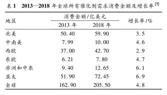 近年,在亞太及非洲和中東地區(qū),包括煉油、聚合、化學(xué)合成等在內(nèi)的所有催化劑需求消費(fèi)金額及增幅均高于歐美發(fā)達(dá)地區(qū)(見表1) 。