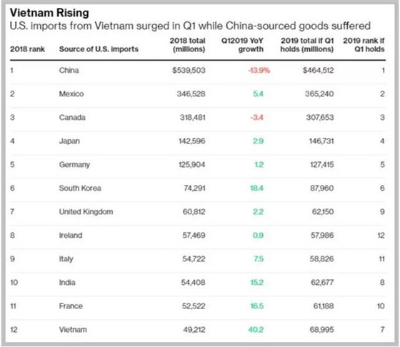 在貿(mào)易戰(zhàn)背景下,今年第一季度中國對美出口下降13.9%;上月包括日本、韓國、新加坡和臺灣等區(qū)域主要經(jīng)濟(jì)體對美出口也都出現(xiàn)下滑,而越南上月對美出口同比增長7.5%。