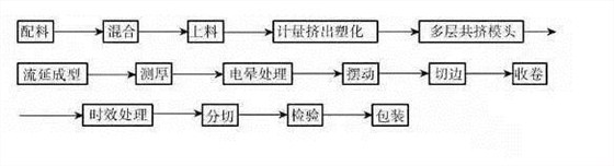 聚丙烯流延薄膜(CPP薄膜)是采用流延的方法生產(chǎn)的一種未拉伸的平膜擠出薄膜,具有透明度好、光澤度高、平整度好、縱橫各向性能平衡、易熱封等特點,表面經(jīng)過電暈處理后可用于鍍鋁、印刷、復(fù)合等方面,所以廣泛應(yīng)用于食品、日用品、電子產(chǎn)品等包裝。其生產(chǎn)工藝流程圖如下: