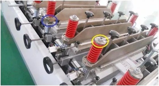 對(duì)于縱封刀,“間隙”的檢查點(diǎn)和壓簧壓力調(diào)整點(diǎn)如下圖所示。